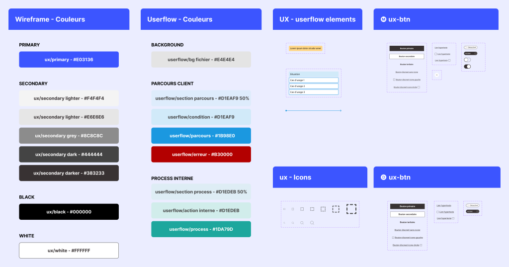 J’ai donc mis en place une bibliothèque de composants et d’écrans UX (wireframes en haute fidélité), en m’appuyant sur la librairie existante sous Adobe XD. Cette bibliothèque couvrait à la fois des composants mobiles pour l’application bancaire et des composants web pour les sites et espaces clients, facilitant ainsi le travail de conception au quotidien.