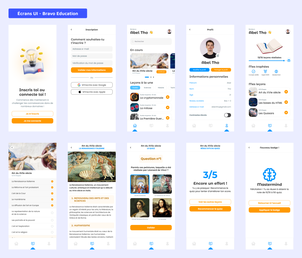 Pour concevoir une interface attractive et adaptée à cette cible, je me suis appuyé sur une phase de veille d’applications éducatives, puis j’ai défini une identité visuelle basée sur un duo bleu et orange, choisi pour son équilibre entre côté rassurant, amical et dynamique, en veillant à assurer une cohérence entre l’identité, les composants du design system et les écrans du prototype final.